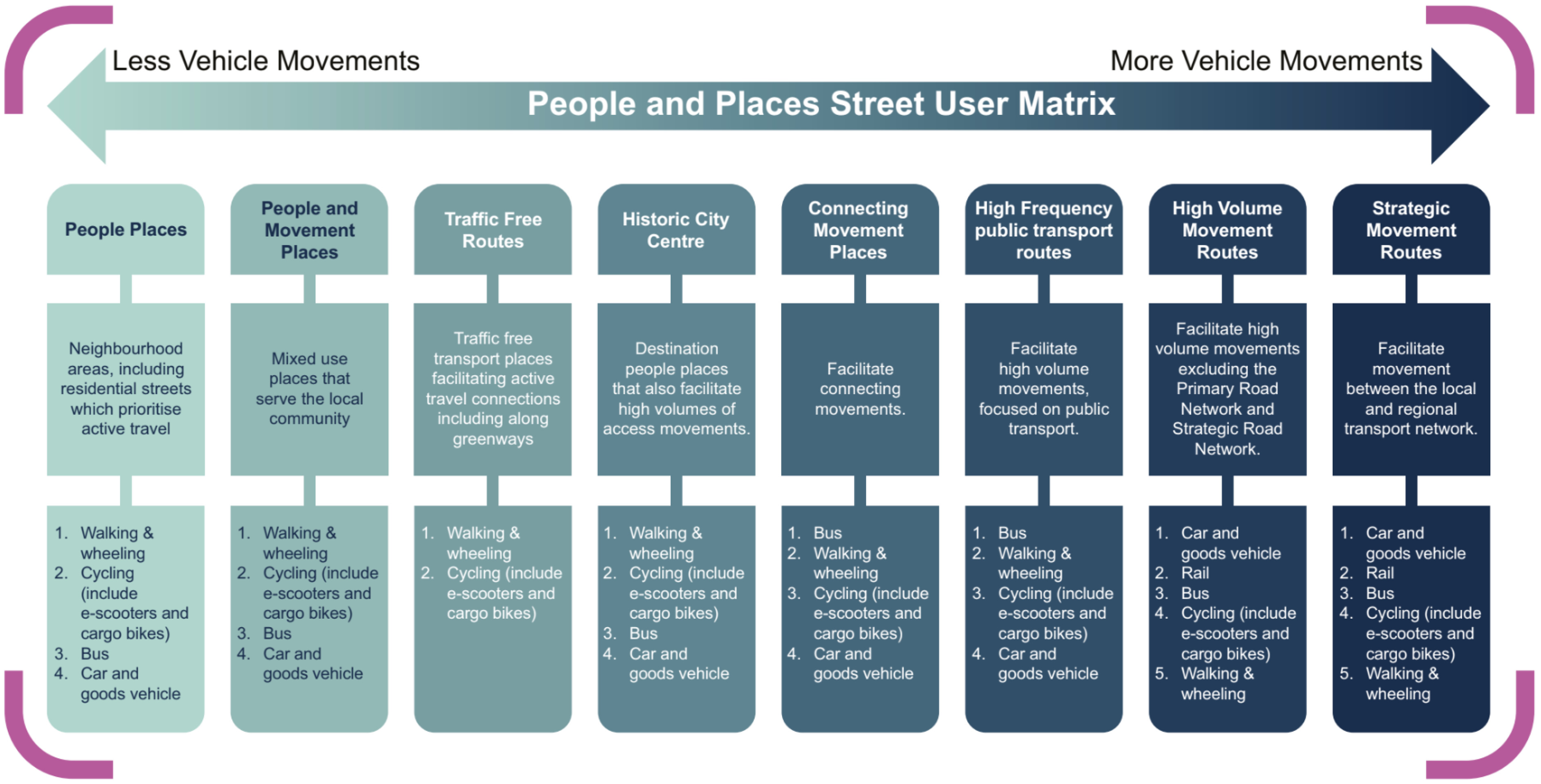 We've developed a Street User Matrix to guide how each road should function—whether it's a place to linger, a route for buses, or a corridor for freight. This helps us prioritise the right modes in the right places.